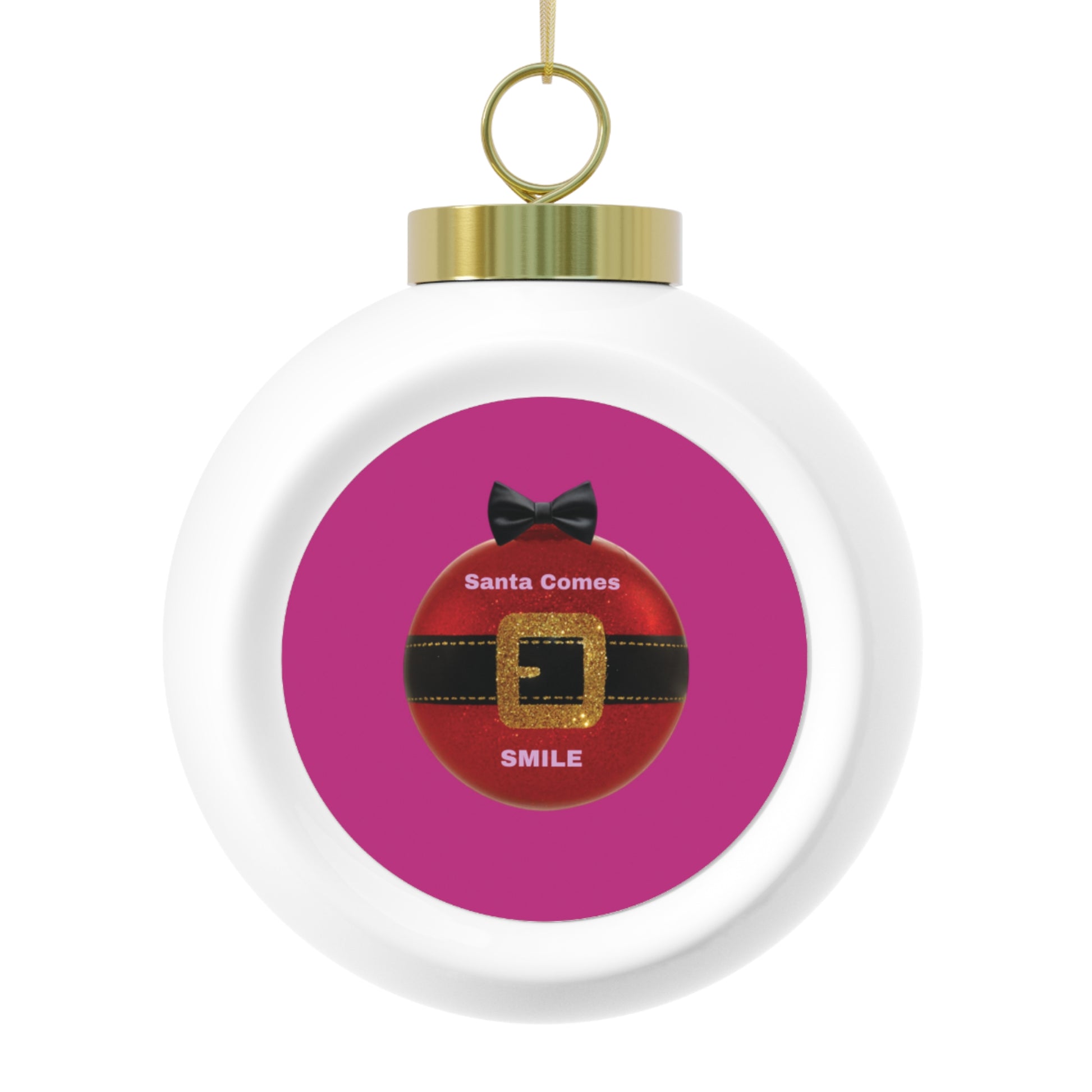 A glossy ceramic Christmas ornament that brings warm, vintage charm to your holiday décor. The smooth white ball frames a bright aluminum insert featuring festive artwork — poinsettias, candles, and a cheerful Santa-belt motif — rendered with vivid, crisp printing. A gold ribbon and hanging hole are included so the ornament arrives ready to hang on a tree, wreath, or mantel garland. The reverse shows a subtle tree or bell silhouette for a layered, decorative look. Lightweight and reflective, it catches twinkling lights and adds a nostalgic, handcrafted feel to seasonal displays and cozy home gatherings.